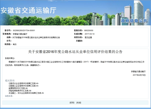 2016年企業(yè)信譽(yù)等級(jí)證明材料安徽省交通運(yùn)輸廳AA級(jí)信譽(yù)等級(jí)查詢網(wǎng)址: