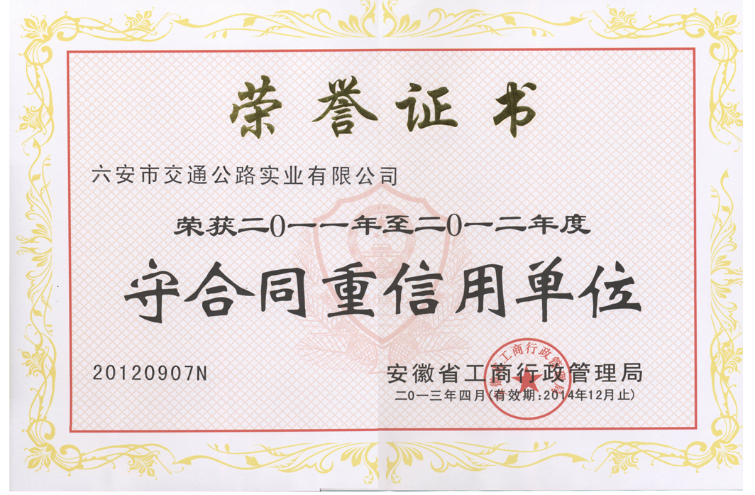 近日,六安市交通公路實(shí)業(yè)有限公司獲譽(yù)由安徽省工商行政管理局頒發(fā)的“守合同重信用”單位稱(chēng)號(hào)。