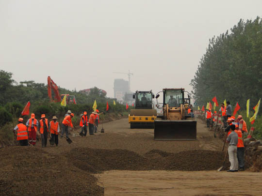 為迎接2012年11月10日在金太陽(yáng)國(guó)際會(huì)展中心開幕的第三屆中國(guó)國(guó)際羽絨節(jié),六安市交通公路實(shí)業(yè)有限公司臨危受命承建G312六安段(金橋西至皖西大道)改建工程延伸段。該工程起于K565+330皖西大道大交叉口處,終點(diǎn)位于K567+200迎賓大道交叉口處,全長(zhǎng)1870米,老路為雙向四車道一級(jí)公路,路基寬24米,采用下挖反填法,碎石化路面。公司上下克服資金緊、工期短、施工難度大等困難,放棄假日休息,全力以赴,日夜奮戰(zhàn),確保按時(shí)、按質(zhì)、按量完成該工程。目前1.1公里換板修補(bǔ)和面層碎石化已結(jié)束,700米挖方段的級(jí)配碎石回填已完成,正在進(jìn)行水穩(wěn)攤鋪,預(yù)計(jì)10月25日完成主體工程。為六安的招商引資創(chuàng)造良好交通環(huán)境,為展示“五色、精彩”六安形象添彩。